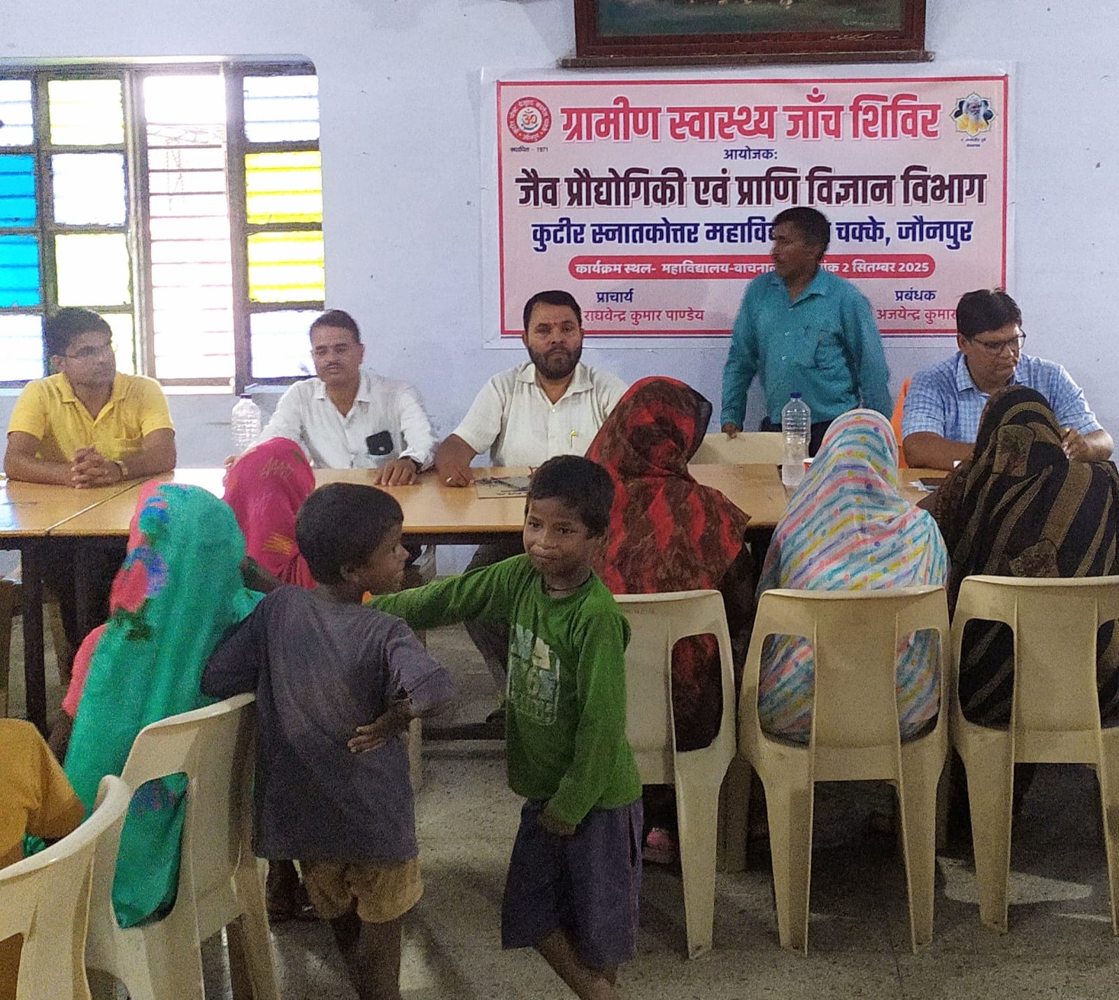 जौनपुर। जलालपुर : जनपद के थानाक्षेत्र जलालपुर के पराऊगंज स्थित कुटीर पीजी कॉलेज चक्के में मंगलवार 2 सितम्बर को ग्रामीण स्वास्थ्य शिविर का आयोजन हुआ जिसमें जन स्वास्थ्य केंद्र रेहटी जलालपुर की मेडिकल टीम ने गरीब असहाय लोगो के स्वास्थ्य की जांच की और उन्हें उचित चिक्तिसिय परामर्श और दवाएं दी। यह स्वास्थ्य शिविर महाविद्यालय के वाचनालय सभागार में जैवप्रौद्योगिकी और प्राणी विज्ञान विभाग के संयुक्त तत्वावधान में आयोजित हुई जिसकी अध्यक्षता कुटीर महाविद्यालय के प्राचार्य प्रो राघवेन्द्र पांडे ने की जबकि कार्यक्रम के कन्वेनर डॉ श्रीनिवास तिवारी रहे। कार्यक्रम में विशिष्ट योगदान कार्यक्रम को- कन्वेनर रविकास मौर्य, स्वास्थ्य केंद्र के डॉक्टर द्वय डॉ हेमंत यादव और डॉ नंदनी जायसवाल, एएनएम रीमा और सुरेश कुमार का रहा । जबकि संचालन डॉ एन पी मिश्र ने किया।