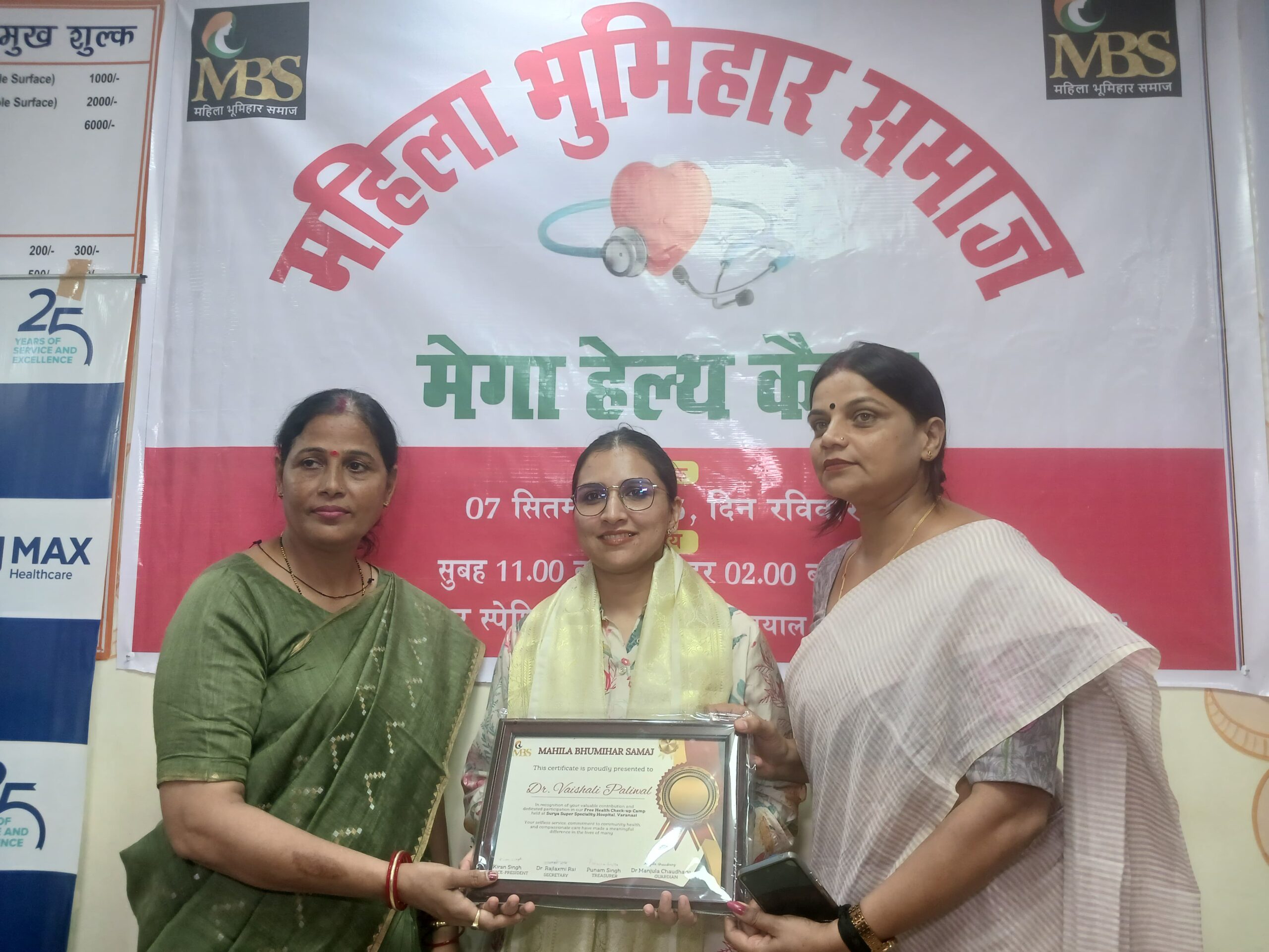 महिला भूमिहार समाज की तरफ से स्वास्थ्य शिविर मे आये हुए सभी डाक्टरों को अंगवरत्रम एवम स्मृति चिंन्ह देकर सम्मानित किया गया।